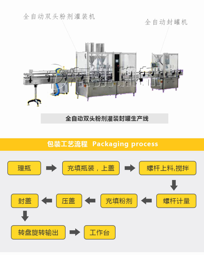 全自動(dòng)粉劑灌裝機(jī)是一款經(jīng)濟(jì)適用的粉末及小顆粒自動(dòng)灌裝機(jī),能完成瓶子自動(dòng)定位,充填及計(jì)量等工作,全自動(dòng)奶粉灌裝機(jī)由一個(gè)充填頭,一臺(tái)鏈板輸送帶及一個(gè)定位裝置組成,全自動(dòng)粉劑灌裝機(jī)采用伺服﹙或步進(jìn)﹚馬達(dá),PLC及觸摸屏控制,操作簡(jiǎn)便,穩(wěn)定性高?膳c理瓶機(jī)、旋蓋機(jī)、貼標(biāo)機(jī)等組成整套灌裝流水線。
