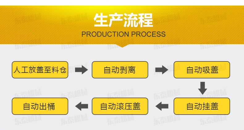 人工放蓋至料倉——自動剝離——自動吸蓋——自動掛蓋——自動滾壓蓋——自動出桶——一個循環(huán)完成。