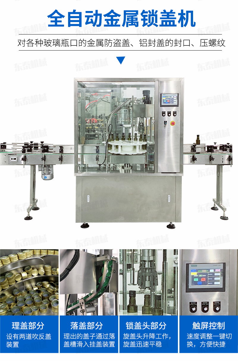 本設(shè)備適用于食品、化妝品、化工等行業(yè),主要針對各種玻璃瓶口的金屬防盜蓋鋁封蓋的封口、壓螺紋等。該設(shè)備可單機(jī)使用,也可以與灌裝機(jī)等設(shè)備組成生產(chǎn)流水線自動作業(yè);