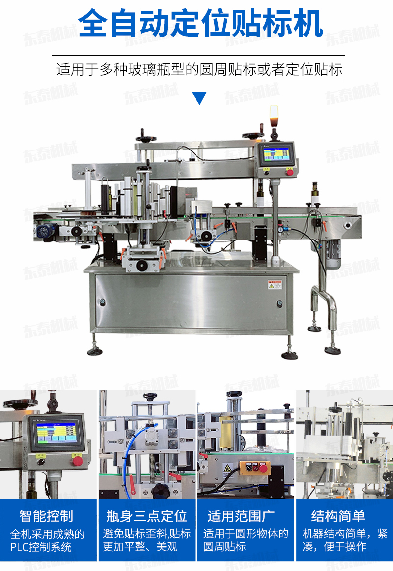 本機(jī)適用于食品、醫(yī)藥、化妝品及其它輕工行業(yè)中的扁瓶貼標(biāo)、方瓶貼標(biāo)、圓瓶貼標(biāo)之理想設(shè)備。功能操作簡單,結(jié)構(gòu)緊湊。采用光電檢測,PLC控制,觸摸式軟件操作,輸送帶、扶正帶、頂帶、卷瓶帶均為無級變頻調(diào)速,具有貼標(biāo)準(zhǔn)確、精度高等優(yōu)點(diǎn);同時具有無物不貼標(biāo),無標(biāo)自動校正、自動檢測等功能。本機(jī)既可單機(jī)使用,也可與其它包裝機(jī)自動連線使用。