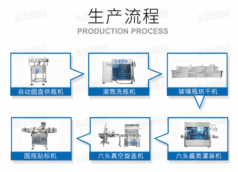 醬料灌裝生產(chǎn)線成套設備組成: 自動供瓶機+全自動滾筒洗瓶機+自動六米烘干機+自動收瓶機+全自動六頭灌裝機自動灌裝+全自動提蓋機自動理蓋、提蓋、掛蓋+六頭真空旋蓋機同時六個頭真空旋蓋+套標機+收縮機+