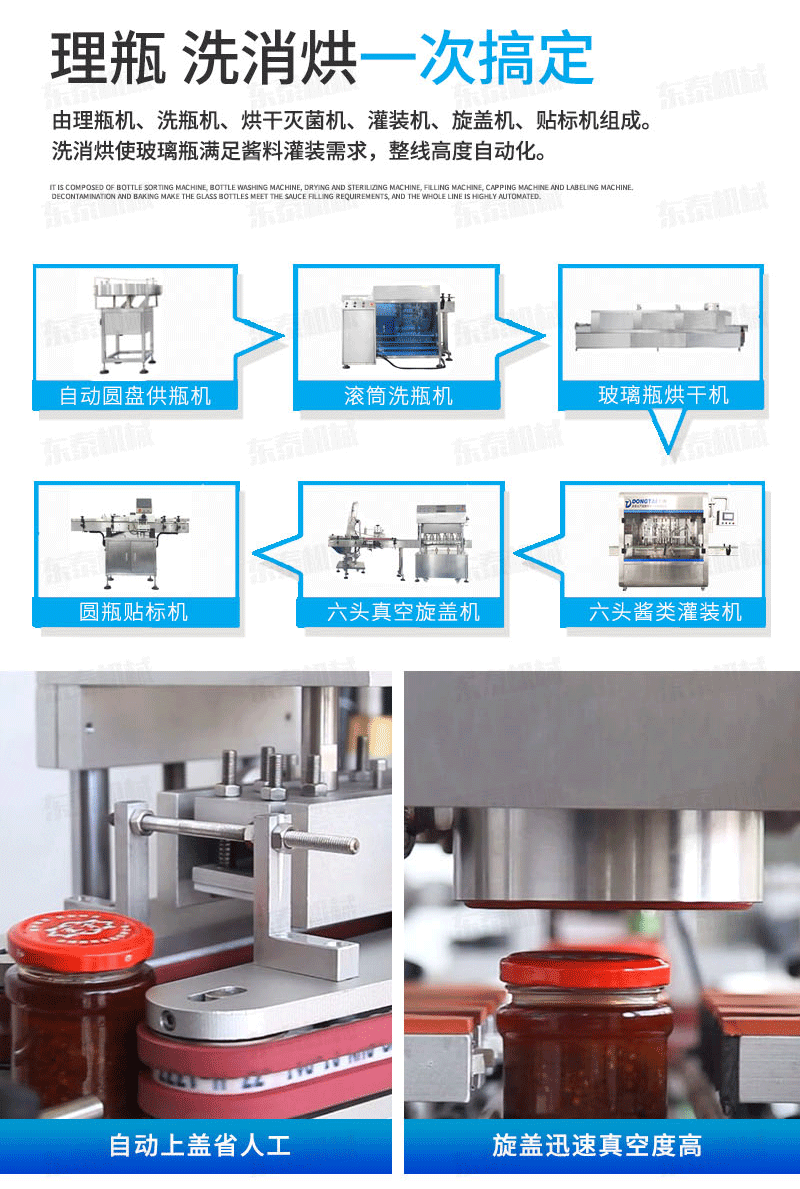 番茄醬灌裝旋蓋生產(chǎn)設(shè)備組成: 自動(dòng)供瓶機(jī)+全自動(dòng)滾筒洗瓶機(jī)+自動(dòng)六米烘干機(jī)+自動(dòng)收瓶機(jī)+全自動(dòng)六頭灌裝機(jī)自動(dòng)灌裝+全自動(dòng)提蓋機(jī)自動(dòng)理蓋、提蓋、掛蓋+六頭真空旋蓋機(jī)同時(shí)六個(gè)頭真空旋蓋+套標(biāo)機(jī)+收縮