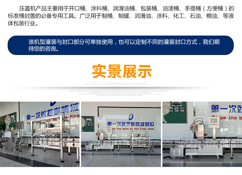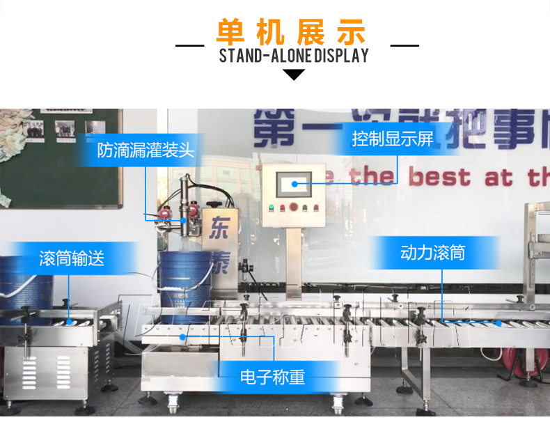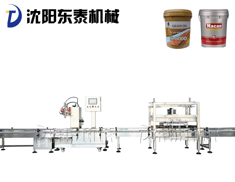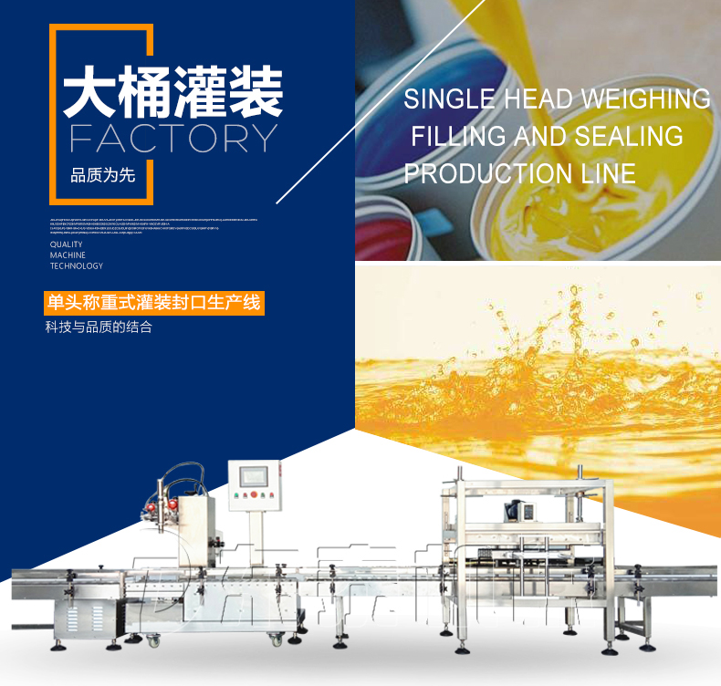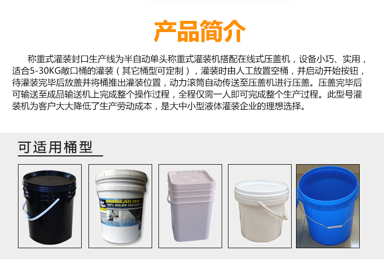 稱重式灌裝封口生產(chǎn)線為半自動(dòng)單頭稱重式灌裝機(jī)搭配在線式壓蓋機(jī),設(shè)備小巧、實(shí)用適合5-30KG敞口桶的灌裝(其它桶型可定制),灌裝時(shí)由人工放置空桶,并啟動(dòng)開始按鈕,待灌裝完畢后放蓋并將桶推岀灌裝位置,動(dòng)力滾筒自動(dòng)傳送至壓蓋杋進(jìn)行壓蓋。壓蓋完畢后可輸送至成品輸送機(jī)上完成整個(gè)操作過程,全程僅需一人即可完成整個(gè)生產(chǎn)過程。此型號灌裝機(jī)為客戶大大降低了生產(chǎn)勞動(dòng)成本,是大中小型液體灌裝企業(yè)的理想選擇。