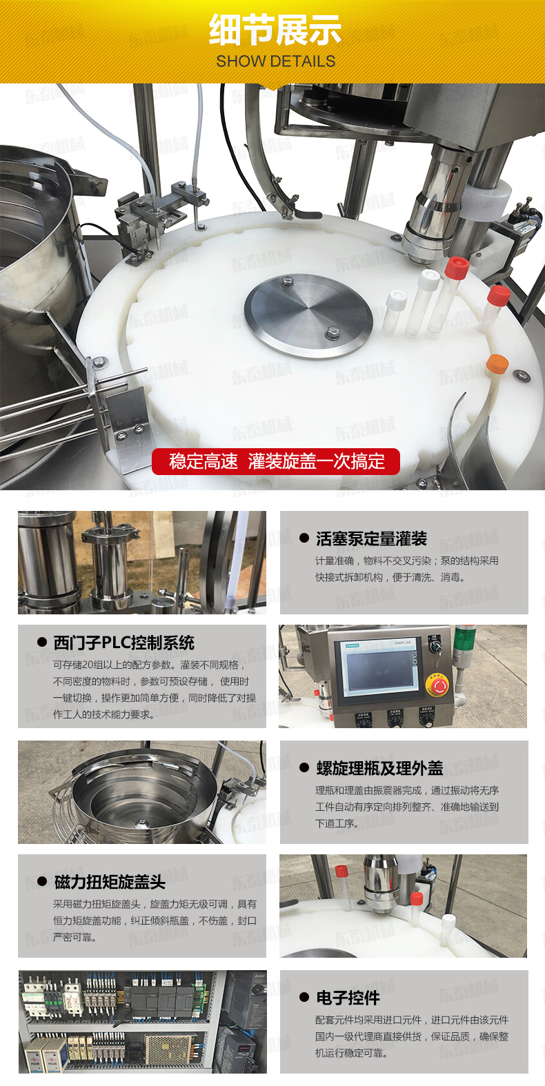時代發(fā)展中科學技術飛速的進步著,使得各行業(yè)發(fā)展都迅速的壯大起來,F在診斷試劑灌裝旋蓋一體機不斷跟隨市場的需要前行被越來越多的應用在食品、醫(yī)藥、化工、日化等各個行業(yè)中有著更加明顯的應用,則是更加凸顯液體灌裝機的優(yōu)勢,診斷試劑灌裝旋蓋一體機不僅是在自動化方面較為突出,售后服務方面可根據客戶的實際生產需求專業(yè)定制個性化需求,來贏得客戶的支持。
