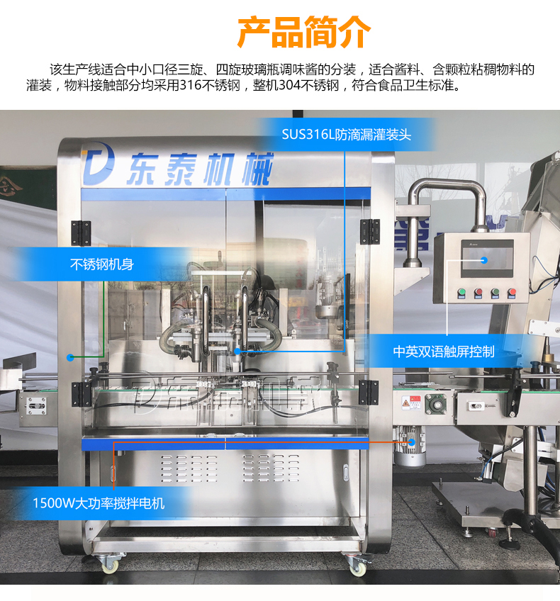現(xiàn)在很多行業(yè)領(lǐng)域的發(fā)展方法都有了一定的更改,為了能使我們的使用者可以相對(duì)于企業(yè)擁有更加深入的了解芝麻醬灌裝機(jī)機(jī)械,不但是擁有完善的售后,還設(shè)有24小時(shí)的熱線電話,也完全打破了傳統(tǒng)的未來(lái)發(fā)展方法,展開了多渠道未來(lái)發(fā)展。芝麻醬灌裝封口機(jī)生產(chǎn)設(shè)備觸摸式操作彩屏,可顯示生產(chǎn)狀態(tài)、操作程序和灌裝方式、畫面目標(biāo)、操作簡(jiǎn)單、維護(hù)方便,期間我們也不斷地提高瓶裝芝麻醬自動(dòng)灌裝機(jī)械的性能選用直瓶進(jìn)瓶、出瓶,使充填功能得以擴(kuò)展,各種形狀的容器得到有效充填從而滿足社會(huì)發(fā)展,如果你也需要一款芝麻醬灌裝封口機(jī)生產(chǎn)設(shè)備,那就到我們東泰來(lái)看看吧!