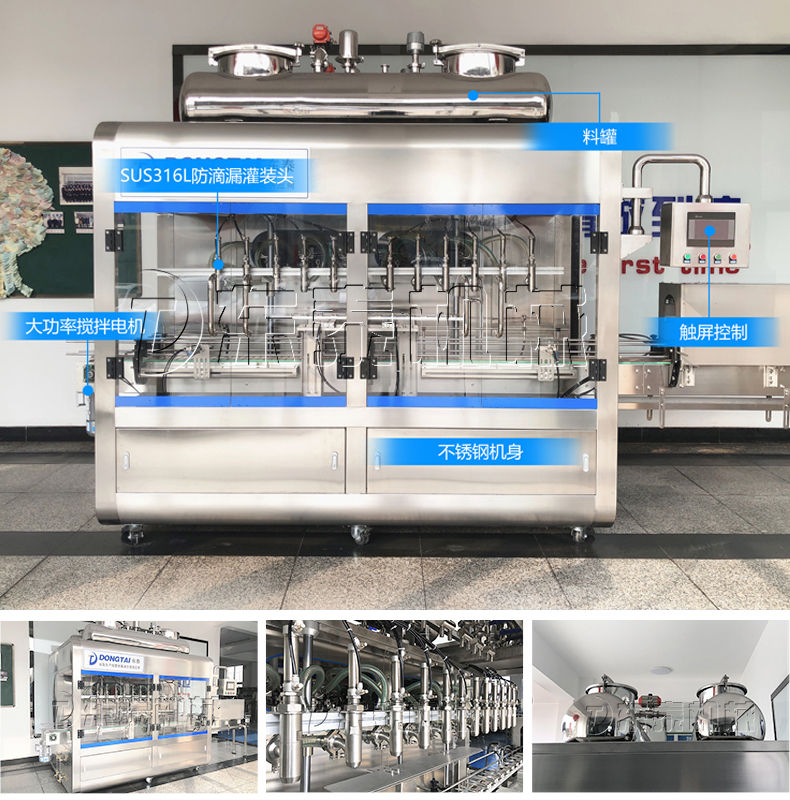東泰生產(chǎn)的這款醬料灌裝機采用高新灌裝機技術的基礎上,進行改造和創(chuàng)新設計的產(chǎn)品,配有自動攪拌功能,結構簡單、精確度高、操作更加簡便。它操作方便,氣動部分均采用德國FESTO和臺灣AirTac的氣動元件。灌裝閥由氣動閥控制,灌裝精度更高,灌裝量和灌裝速度均可任意調(diào)節(jié),灌裝悶頭采用防拉絲及升降灌裝裝置,物料接觸部分均采用316L不銹鋼材料制成,符合GMP要求。